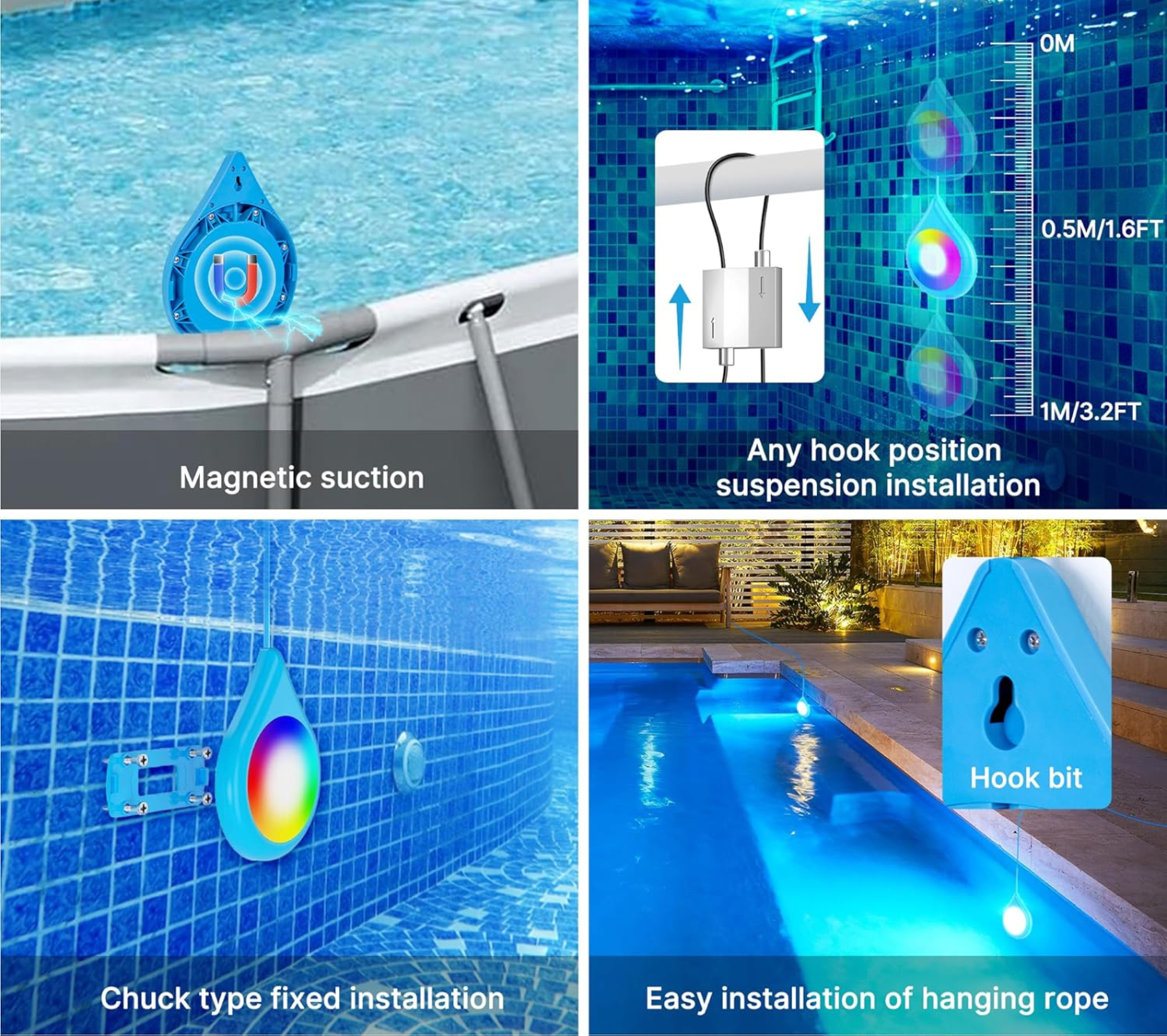 A lámpa percek alatt, fúrás nélkül telepíthető: mágnesesen rögzíthető acélfalas medencékhez, míg a mellékelt fémalappal bármilyen más felületre is biztonságosan felszerelhető. A mágnes felületét szilikonbevonat borítja, amely ütésállóvá teszi azt. A mágnes biztonságosan rögzíti a medencelámpát, így az nem fog elmozdulni a vízben.