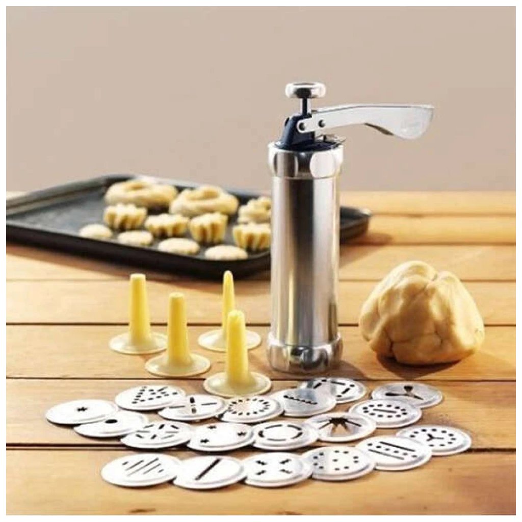 - Leírás: A Biscottu egy 25 darabos süti és sütikészítő készlet. Egy sütiből és süteményprésből, valamint 24 különböző bővítményből áll. A készlet kezelése egyszerű, elég lecsavarni a prés karikáját, ráhelyezni a kívánt hosszabbítót és megtölteni tésztával vagy mázzal. A sütik úgy készülnek, hogy a nyomókart 90 fokos szögben megnyomják egy sík felületen.