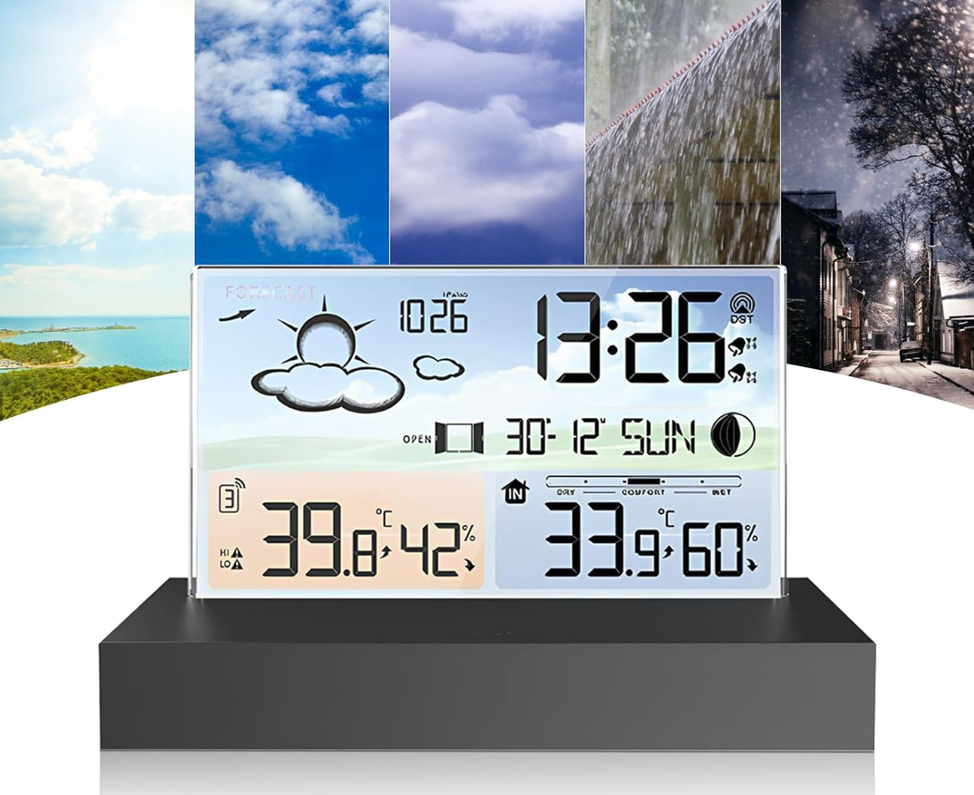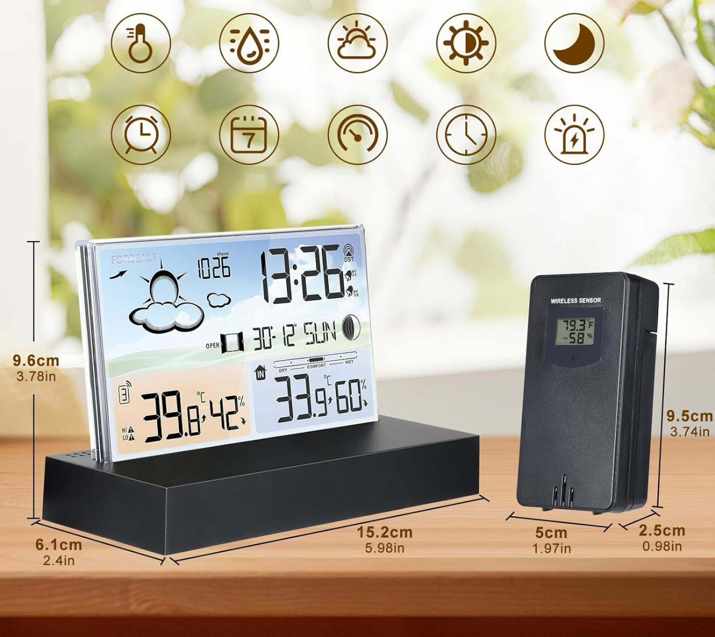 A házi időjárás állomás 5 féle időjárás előrejelzést kínál (napos, felhős, borult, esős és havas) és időjárás trend kijelzést, amely előrejelzi a következő 12 óra időjárását. Emellett fagyriasztó funkcióval, komfort indikátorral és ablak nyitás/zárás emlékeztetővel is rendelkezik, hogy naprakész legyen a beltéri környezettel kapcsolatban, ideális az idősek és gyermekek számára. A készlet nem csak egy időjárás állomás, hanem ébresztőóra is, manuálisan beállítható idővel és 5-30 perces szundi funkcióval.