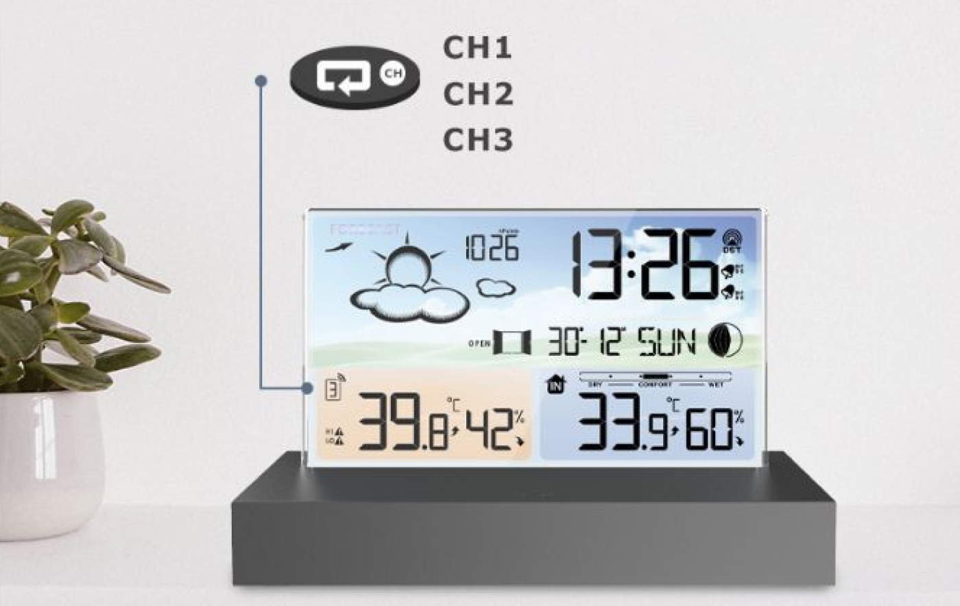 Az időjárás állomás egy LCD színes kijelzővel rendelkezik, amely 4 fényerősségi szintet kínál: erős fény, közepes fény, alacsony fény és nincs fény. A kijelzőn minden fontos adat egy pillantással megtekinthető, mint például az idő (12 órás vagy 24 órás formátumban), dátum és hét, 12 szintű holdfázis kijelzés, 5 szintű szobai klímakomfort kijelzés és ablak nyitás/zárás emlékeztető funkció. A készülék 7 nyelven használható (angol, német, olasz, francia, spanyol, holland és dán), könnyen olvasható.