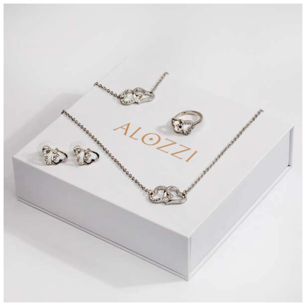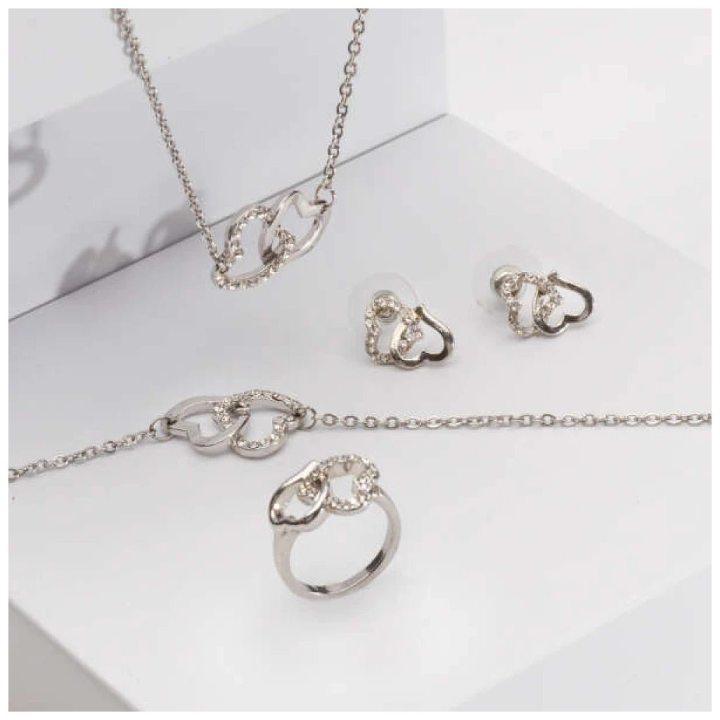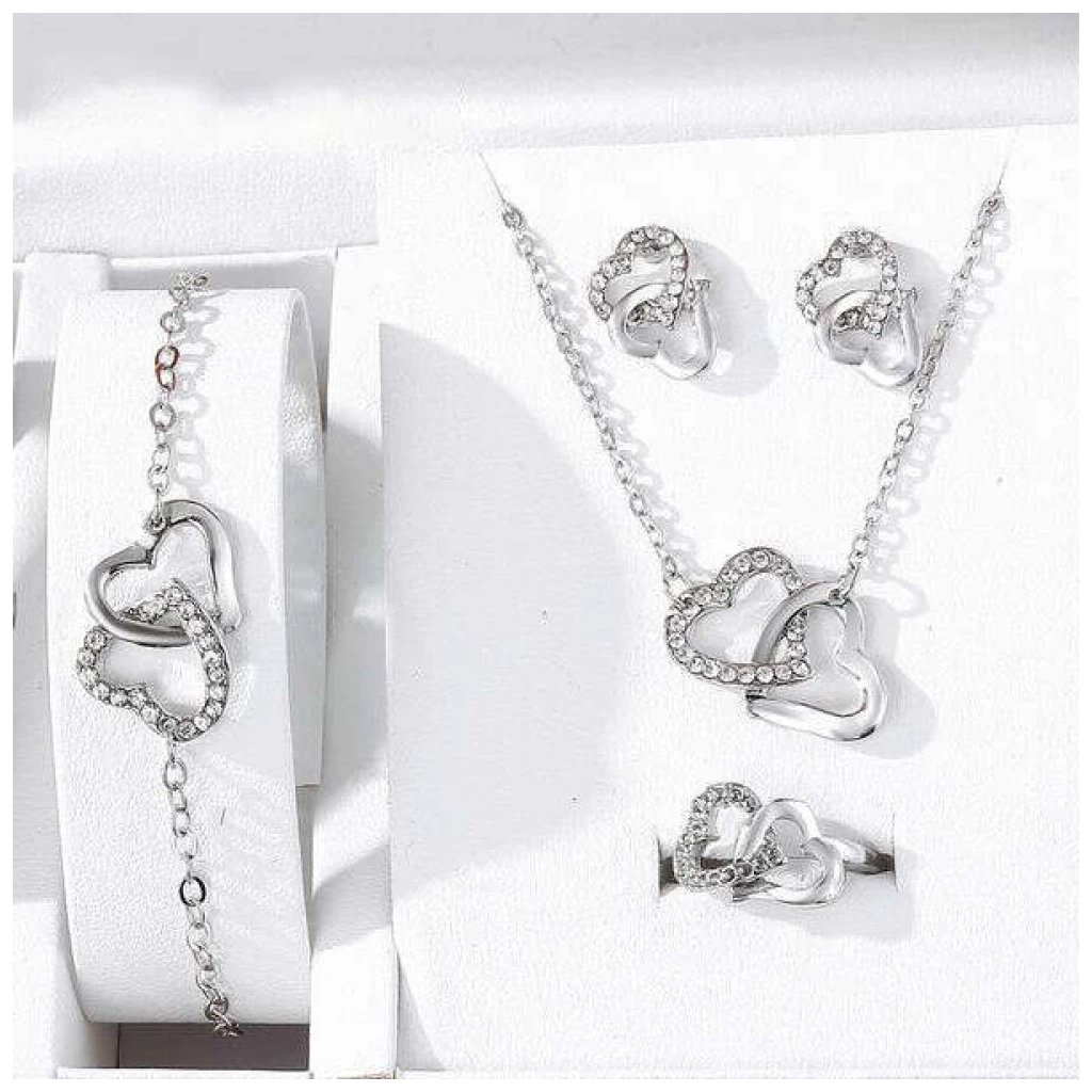 Fidda ékszerkészlet - Egyedi szett, amely tartalmaz egy luxusgyűrűt, nyakláncot, karkötőt és fülbevalót. A készlet cinkötvözetből készült, strassz díszítéssel, szív motívumokkal, amely romantikus megjelenést kölcsönöz viselőjének. Ez a pazar ékszerkészlet tökéletes választás esküvőkre, ünnepekre és más különleges eseményekre. A klasszikus, mégis modern dizájn lehetővé teszi, hogy a darabokat együtt vagy külön-külön is viselhesd, így könnyen kombinálhatóak más kiegészítőkkel is.