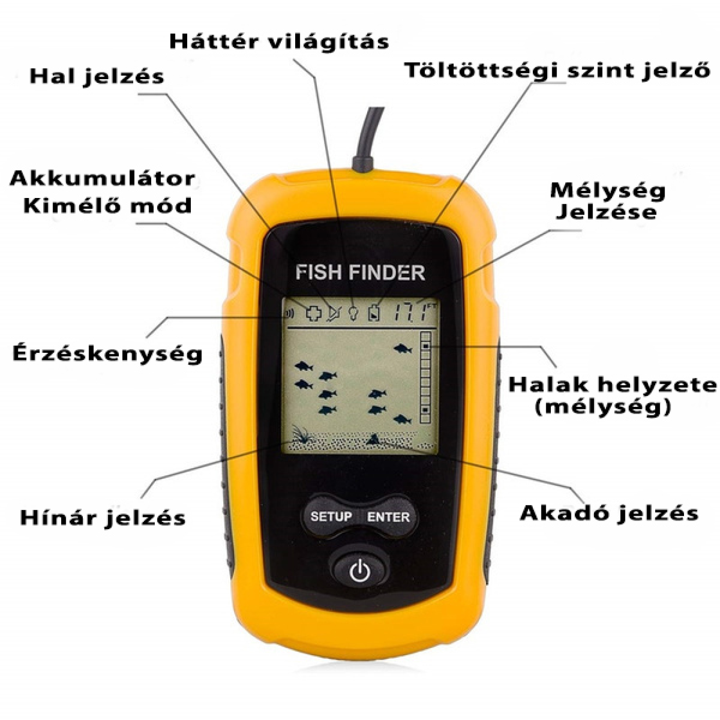 5 cm képernyő, szenzorral mely a halak pozícióját, mélységét, és az akadályokat is jelzi.
