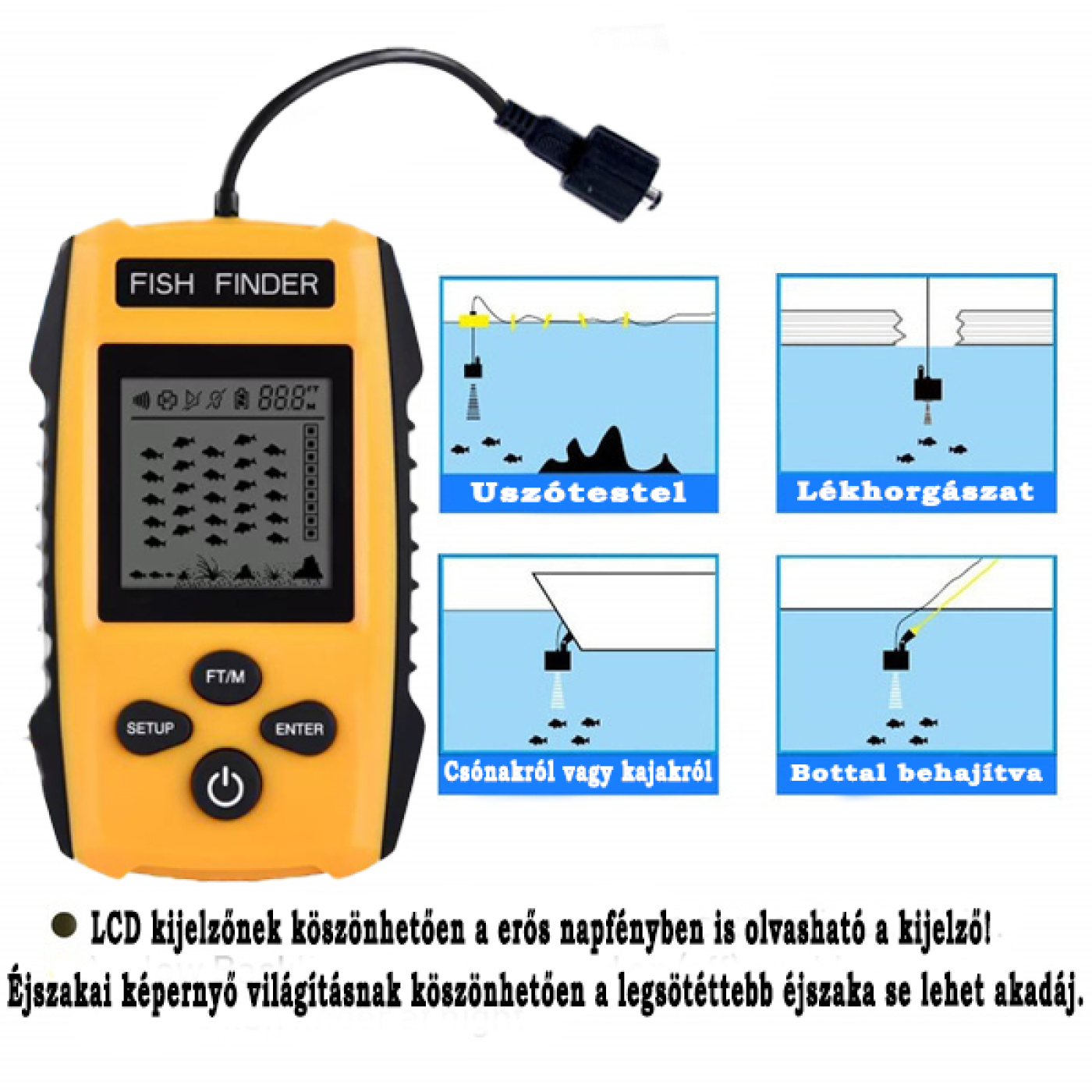 Kiváló funkcióinak köszönhetően a hal keresőt bármilyen körülmények közt használhatja, bármikor, amikor Önnek a legmegfelelőbb időben, ködben, éjjel, hajnalban, napsütésben. Sötétben a be és kikapcsolható energiatakarékos megvilágítás biztosítja a berendezés sikeres használatát.