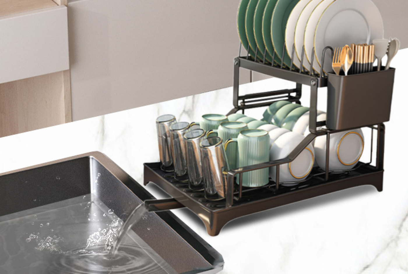 - Sokoldalú elhelyezés – A felső szárítópolc a pulton, a mosogató fölött vagy akár a szekrény alatt is elhelyezhető, hogy megfeleljen az egyedi konyhai igényeknek.