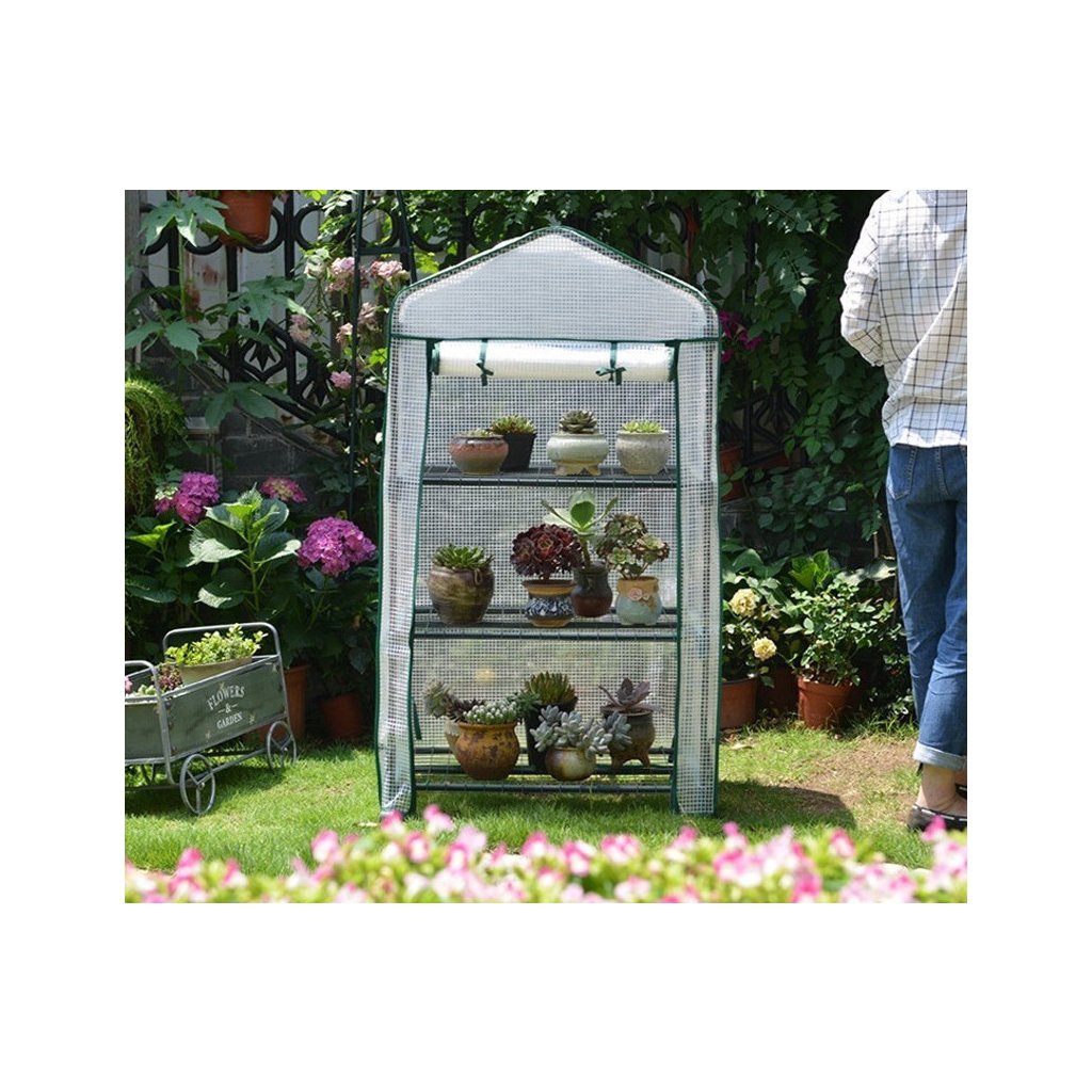 A mini mobil üvegház egy kompakt, háromszintes kialakítású melegház, amely ideális megoldást nyújt kisebb kertekhez, teraszokhoz vagy akár erkélyekhez. Méretei, 69 cm szélesség, 49 cm mélység és 125 cm magasság, lehetővé teszik, hogy könnyedén elférjen szűkös helyeken is, miközben elegendő teret biztosít a növények számára.