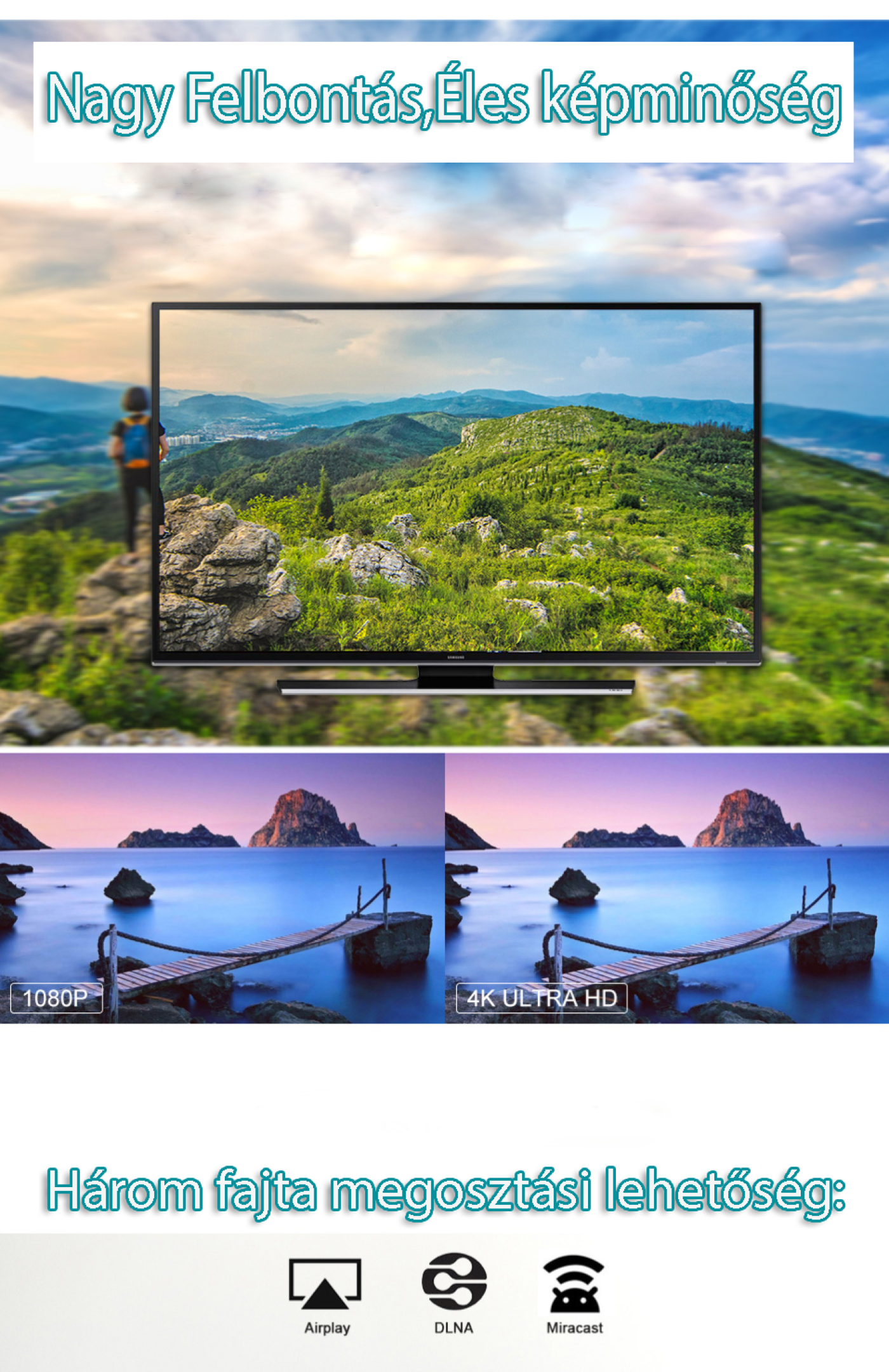 - Támogatja a képernyőmegosztást: Miracast, Airplay, DLNA