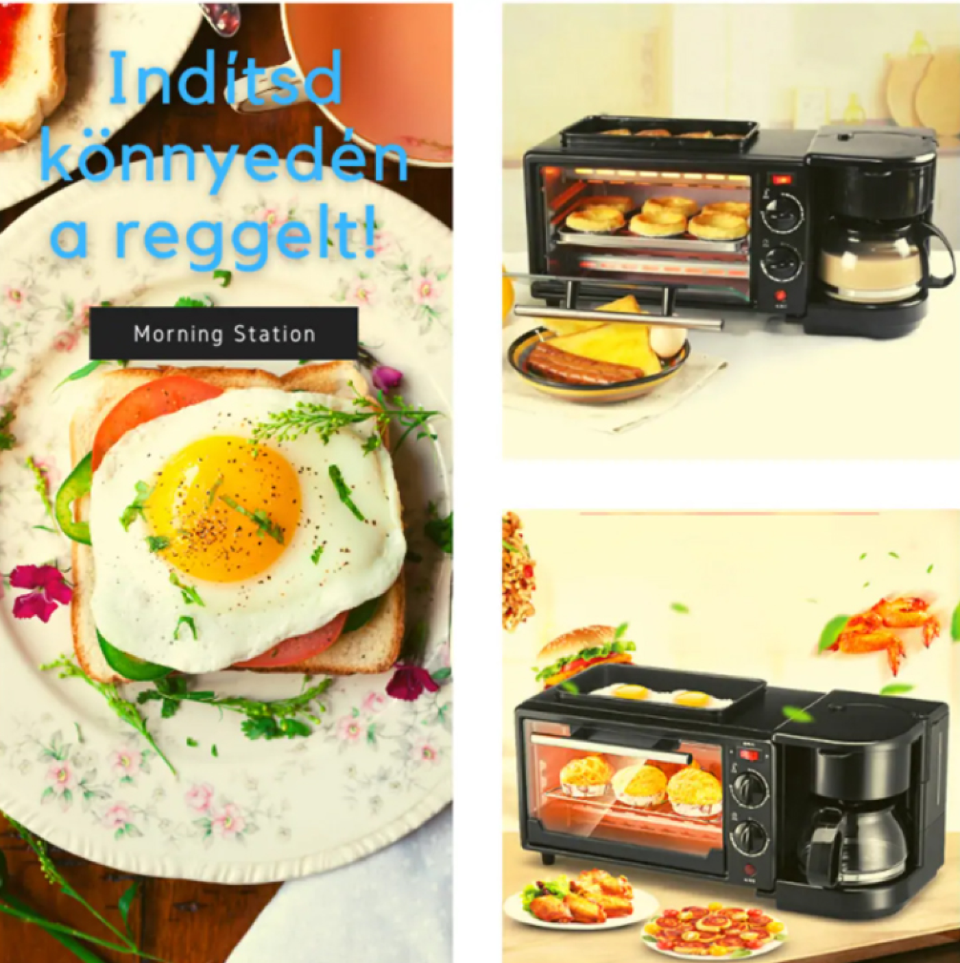 Családi Komplett Multifunkciós Reggeliző állomás – 3 az egyben reggeli készítő gép, grill funkcióval, kávéfőzővel, kenyérpirítóval! Igazi Álom reggeli! Otthonra, de magával viheti utazásokhoz is!