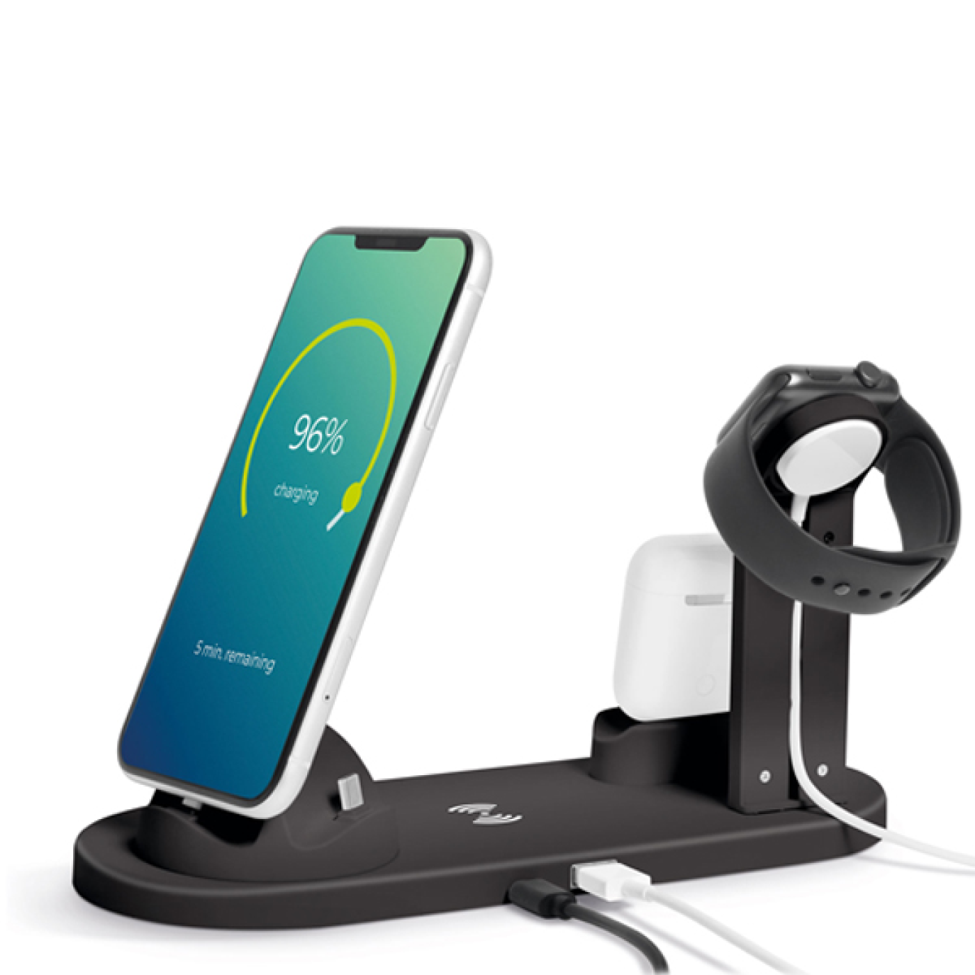 A bal oldalon kialakított lightning csatlakozó lehetővé teszi AirPods fülhallgatók töltését, a vezeték nélküli töltő segítségével feltölthetjük mobiltelefonunkat (ha gyárilag rendelkezik ilyen funkcióval), de a töltőállomásba könnyen integrálható Apple Watch töltőmodul is, így minden eszközünk egy helyen tölthető, akár egy időben is.
