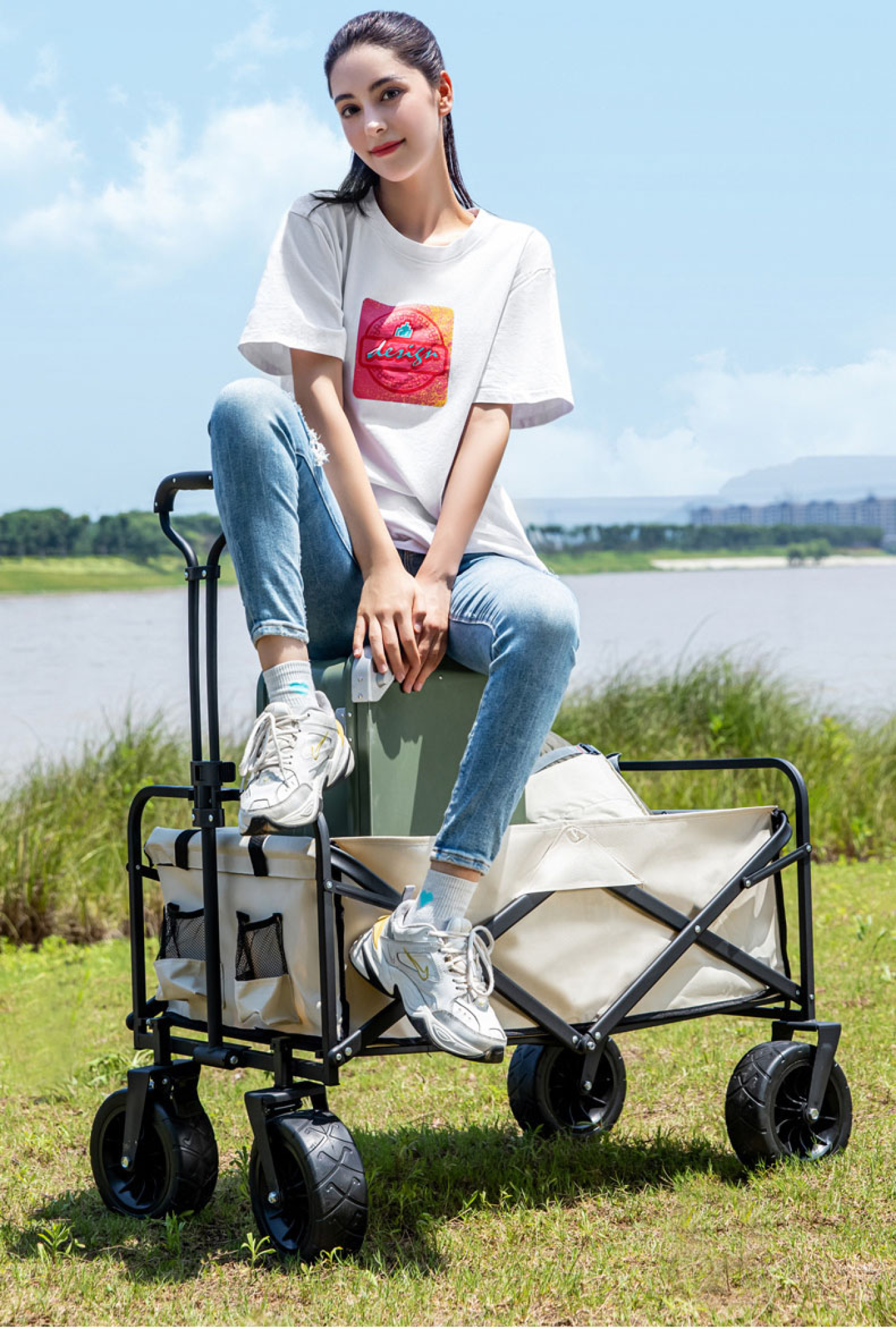 A bézs színű összecsukható kézi kocsi tökéletes választás azok számára, akik könnyedén és kényelmesen szeretnék szállítani a terheiket, legyen szó bevásárlásról, piknikezésről,horgászatról vagy akár utazásról. Ez a praktikus és strapabíró kocsi kiváló minőségű fém anyagból készül, amely hosszú élettartamot és megbízhatóságot garantál.