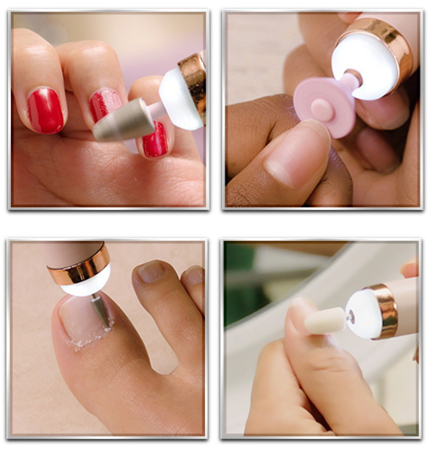 A csomagban 5 különböző fejhozzátartozót talál, amelyeket tetszés szerint kicserélhet. A gyémántfej eltávolítja a kérges bőrt és a bőrkeményedést. A kis és nagy csiszolókúp a körmök durva és hullámos területeinek simítására szolgál. A polírozó tartozék gyönyörű és sima körömfelületet biztosít. A speciális rózsaszín hosszabbítófej segítségével végre nyírhatja és formázhatja körmeit elképzelései szerint.
