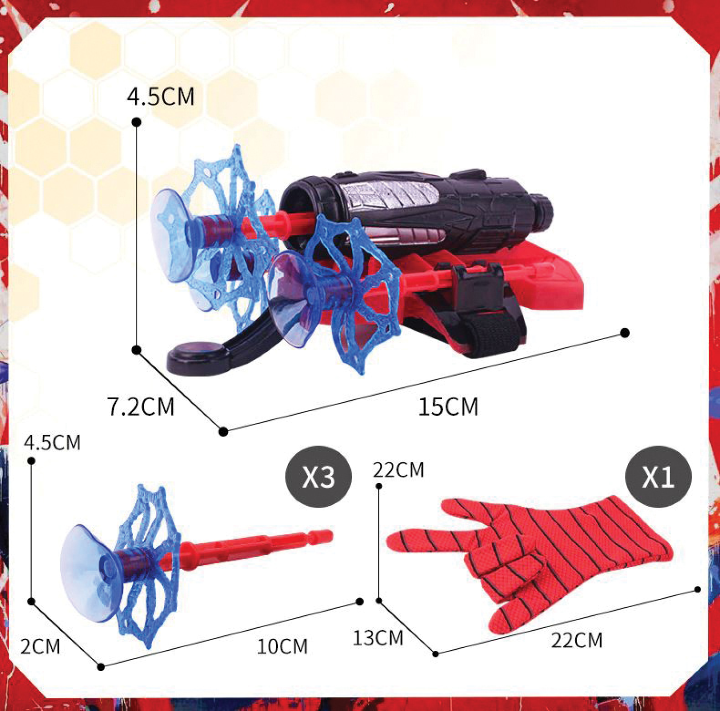 A csomag tartalma: Spóderman gyerek méretű kesztyű (1db), nyíl kilövő(1 db), tapadókorongos nyíl (3db)