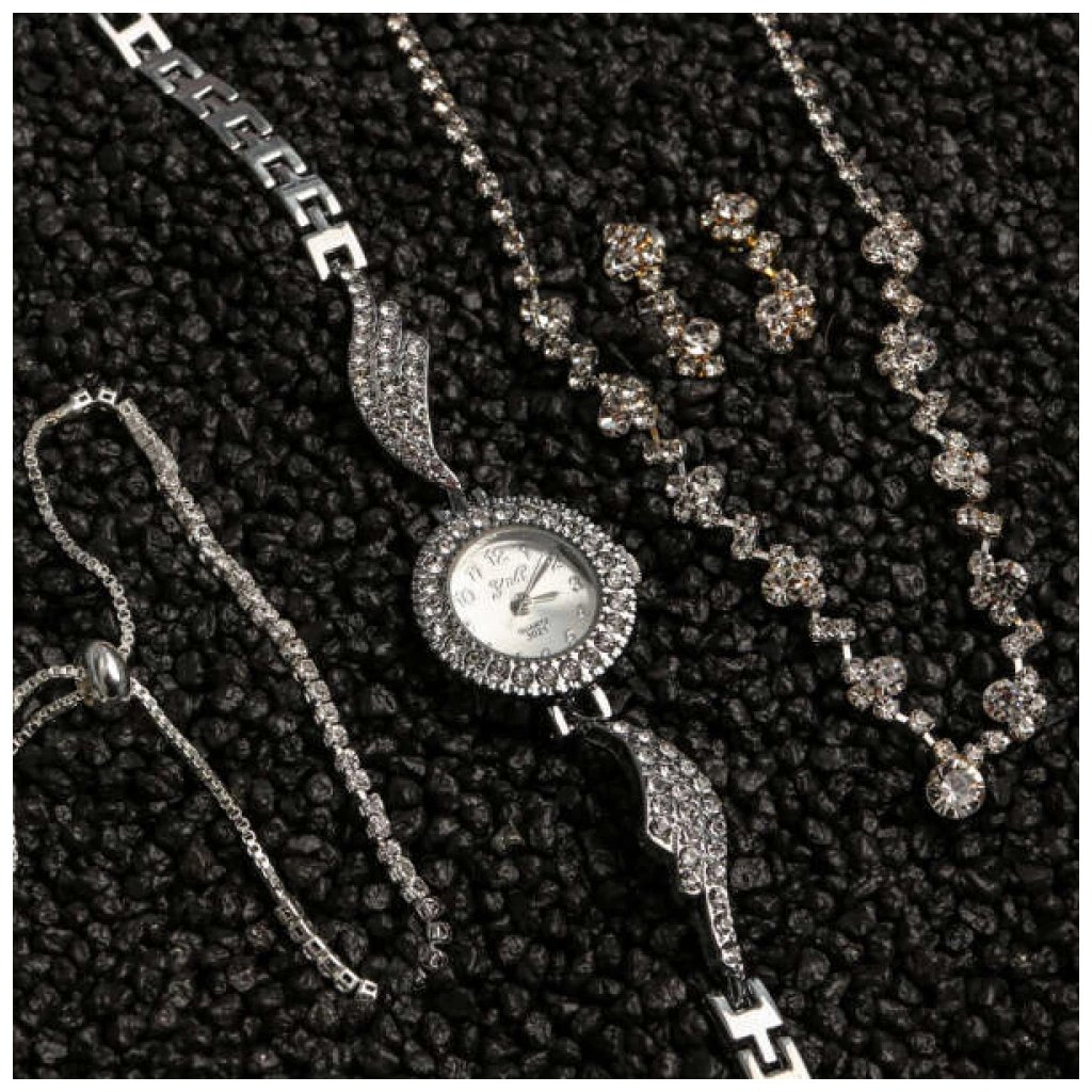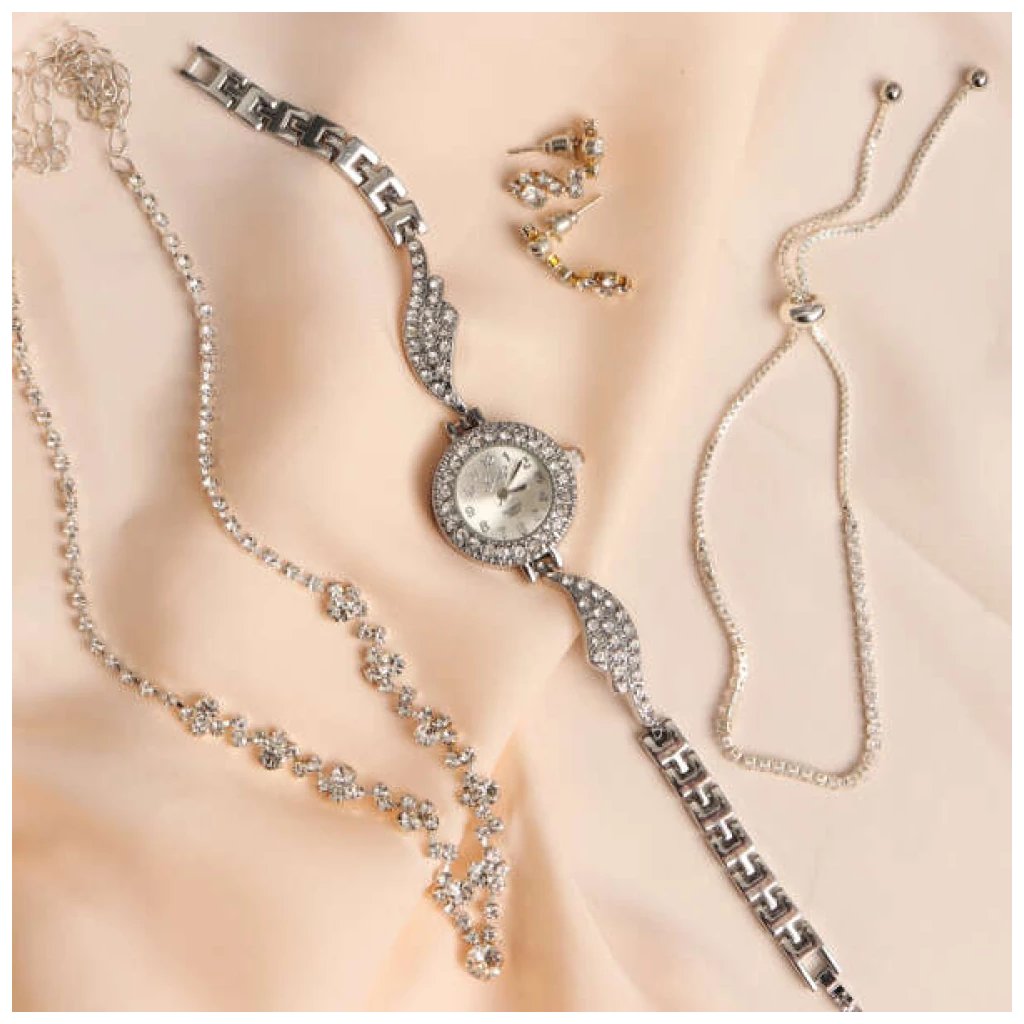 ékszerkészlet, luxus óra, nyaklánc, karkötő, fülbevaló, ezüst szín, divatkiegészítő, női ékszer, ajándék nőknek, strasszkő