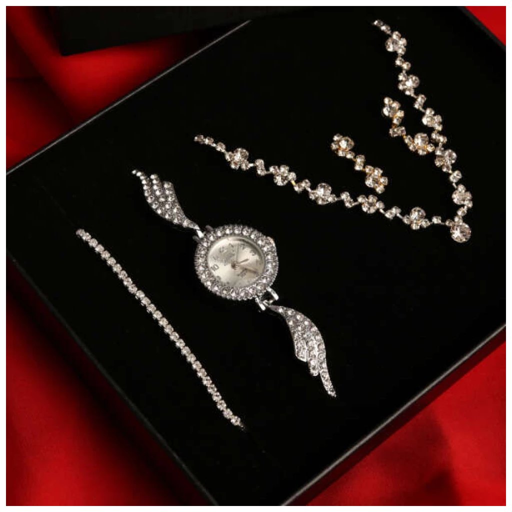 Ez a lenyűgöző, 4 részes ékszerkészlet – luxus órával, nyaklánccal, karkötővel és fülbevalóval – minden nőt különlegessé varázsol. Tartalmaz mindent, amire egy nőnek szüksége lehet ahhoz, hogy magabiztosnak és elegánsnak érezze magát különleges vagy hétköznapi alkalmakon is.
