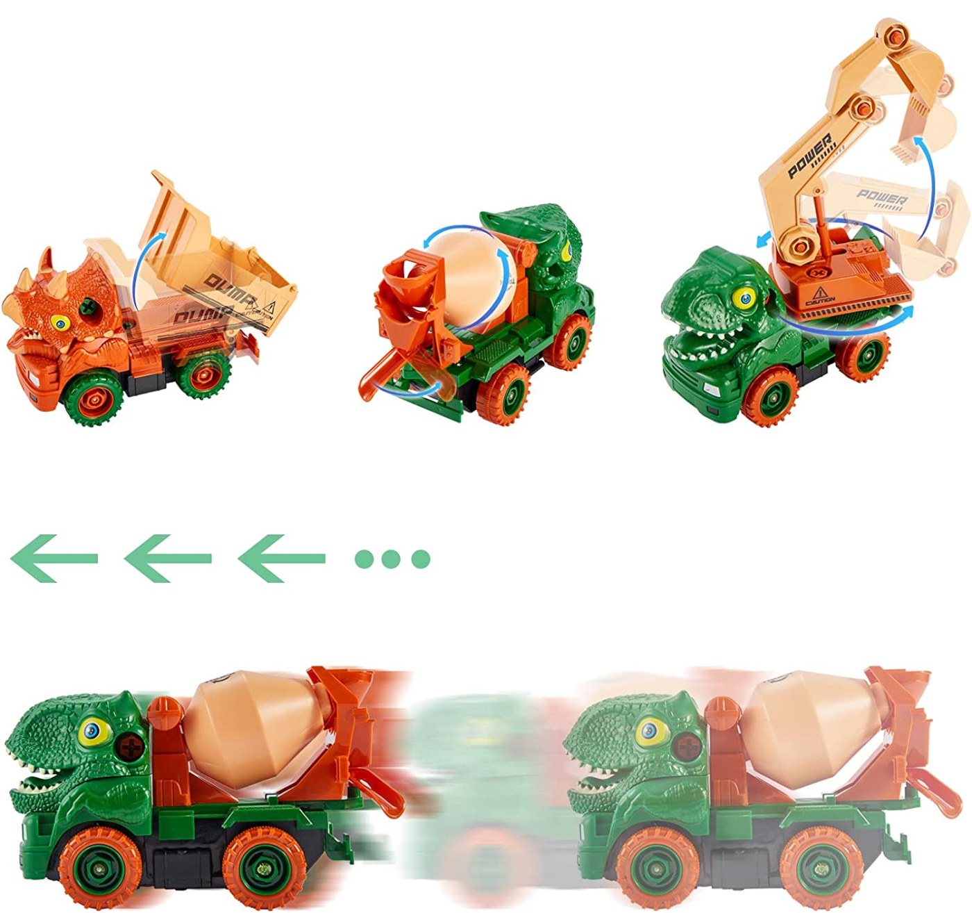Minden teherautó fel- és szétszerelhető a mellékelt csavarhúzókkal. A teherautót a dinoszauruszfejek vagy abroncsok cseréjével is megépítheti.