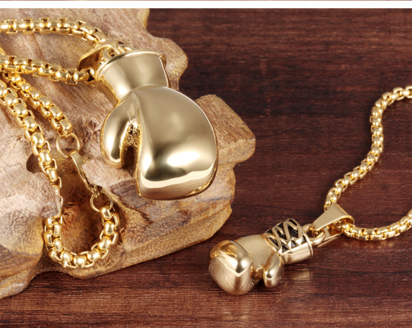 Arany színű medál nyaklánccal. A kifinomult medál egy gyönyörű ajándék a boksz- és a harcművészetek szerelmeseinek.